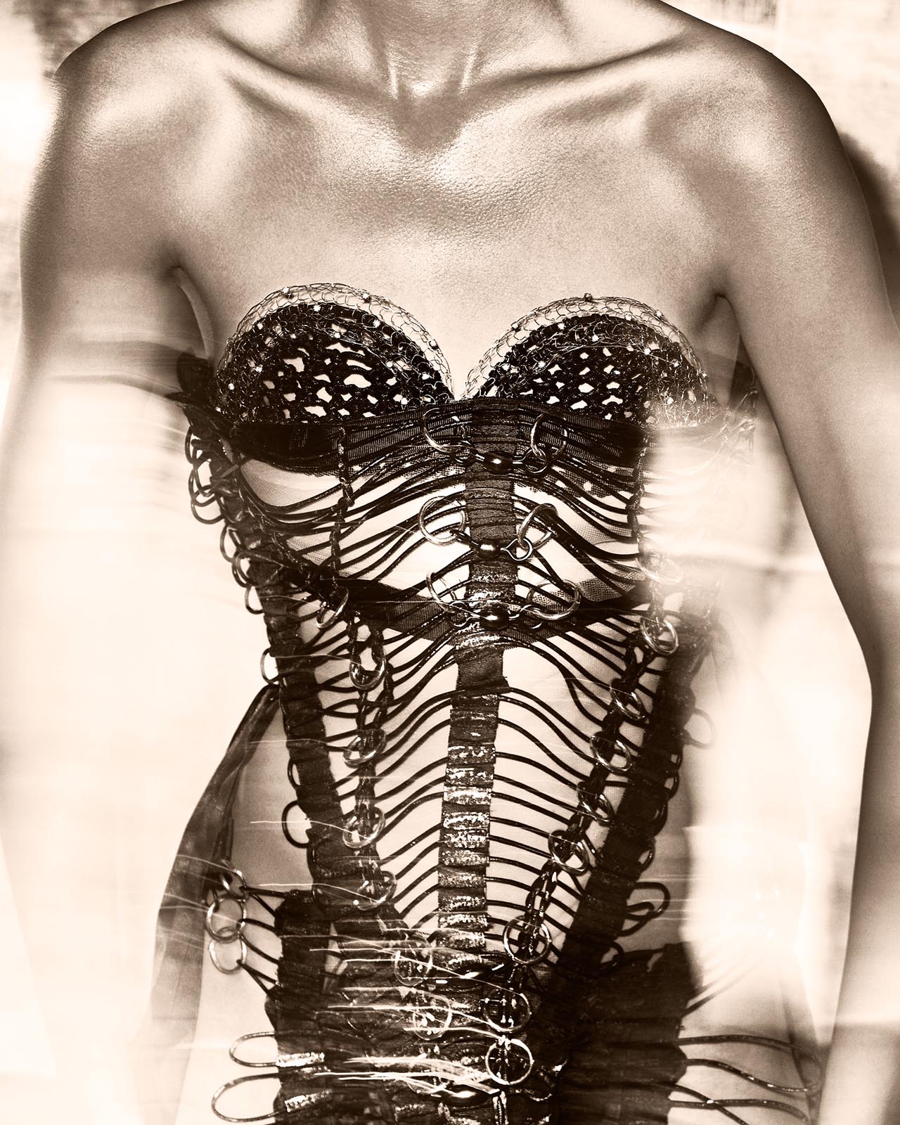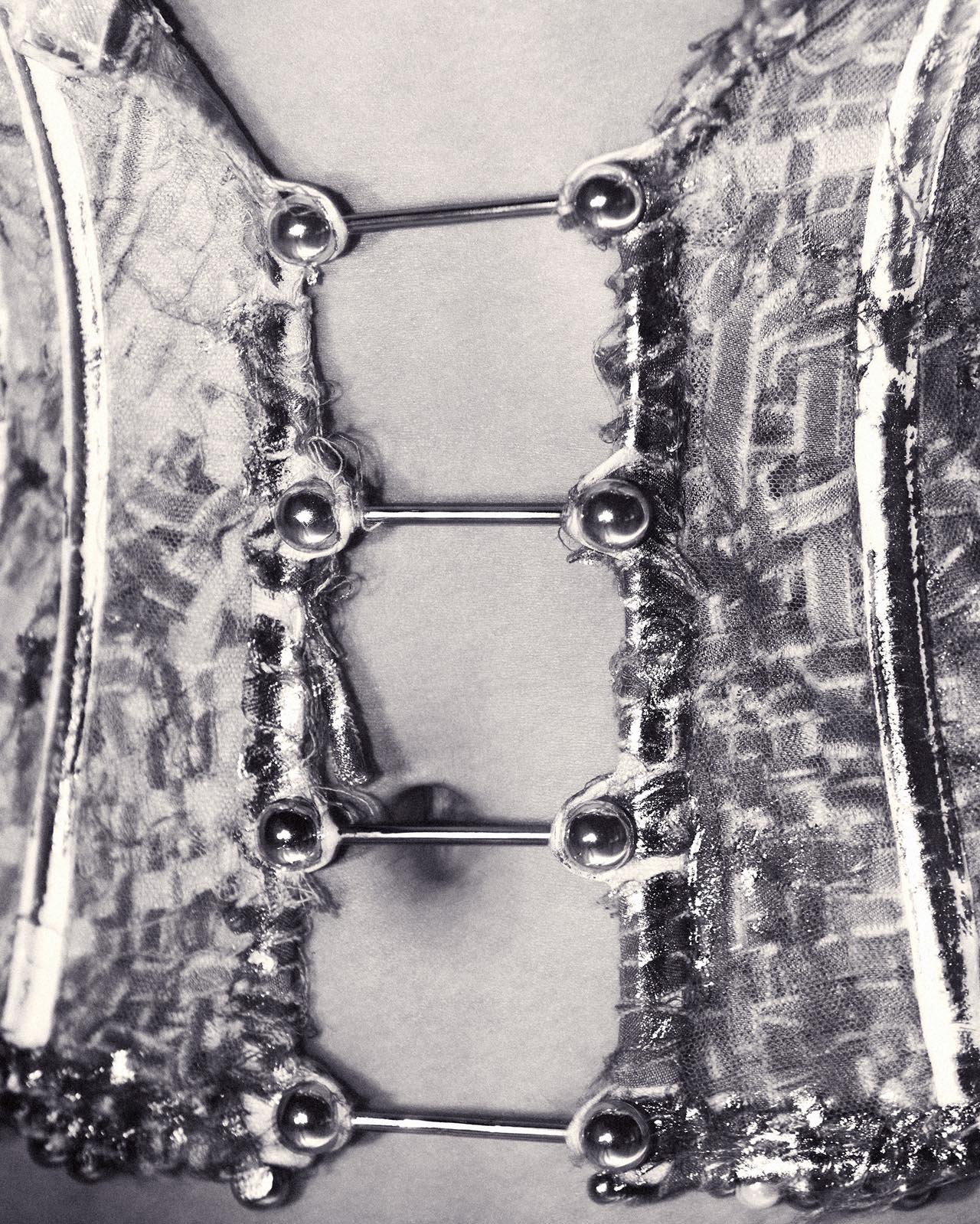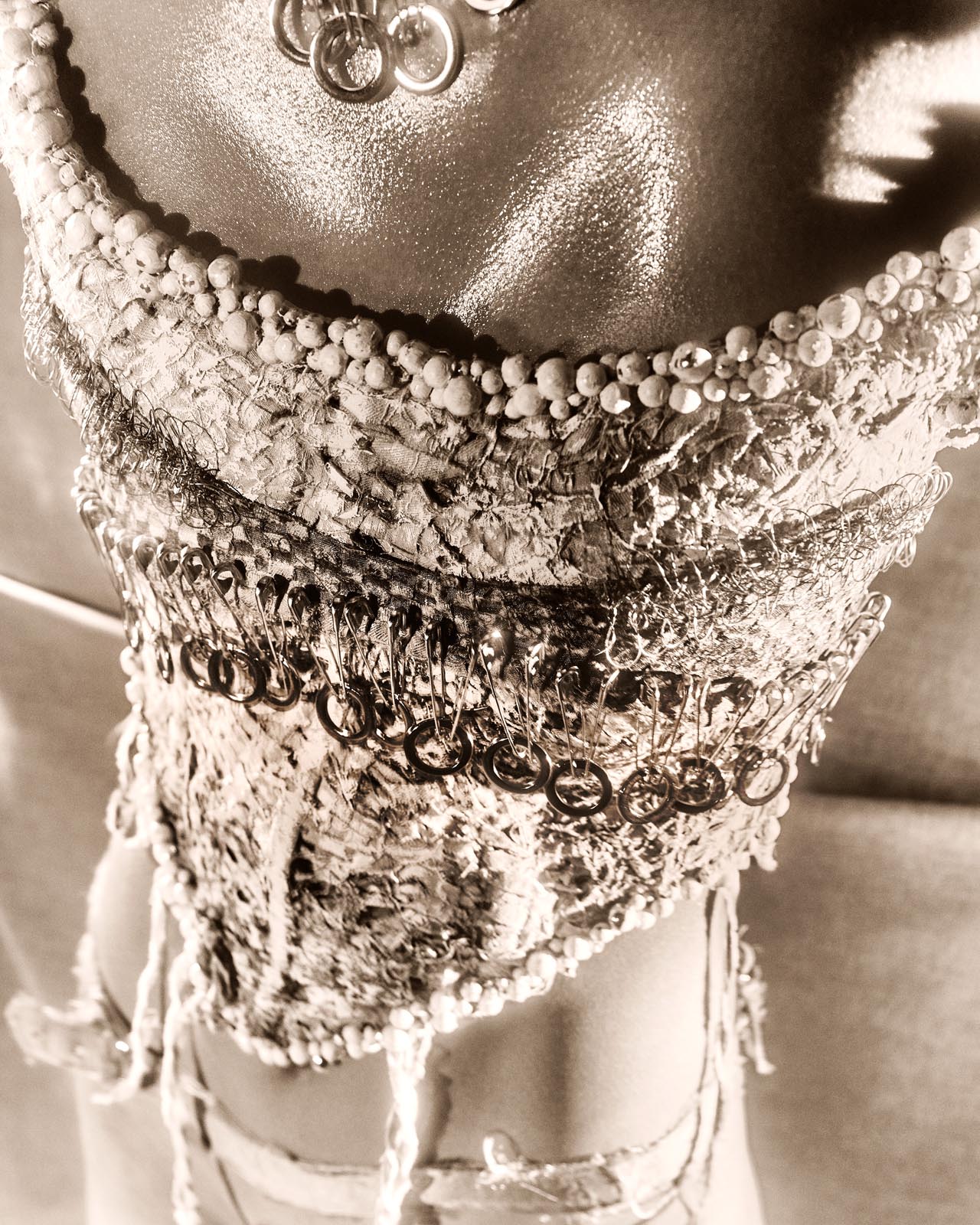 Há também muito do meu olhar para a joalheria, que é uma paixão antiga, mas não aquela joalheria convencional. Existe algo de inquieto no meu processo criativo, uma necessidade de tirar as coisas do lugar comum. Gosto de fuçar em lojas de material de construção, experimentar correntes, brocas, pregos, parafusos, enfim, tudo que é mais bruto.